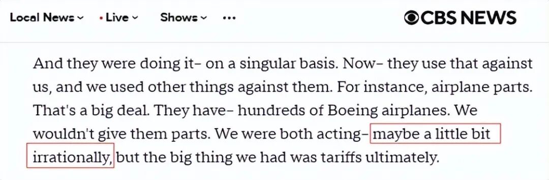 当然,在特朗普的语境里,“有些失去理智”是中美两国都出现的情况,以此想表达“错不完全在美方身上”“美方一定程度上受到了中方的影响”。